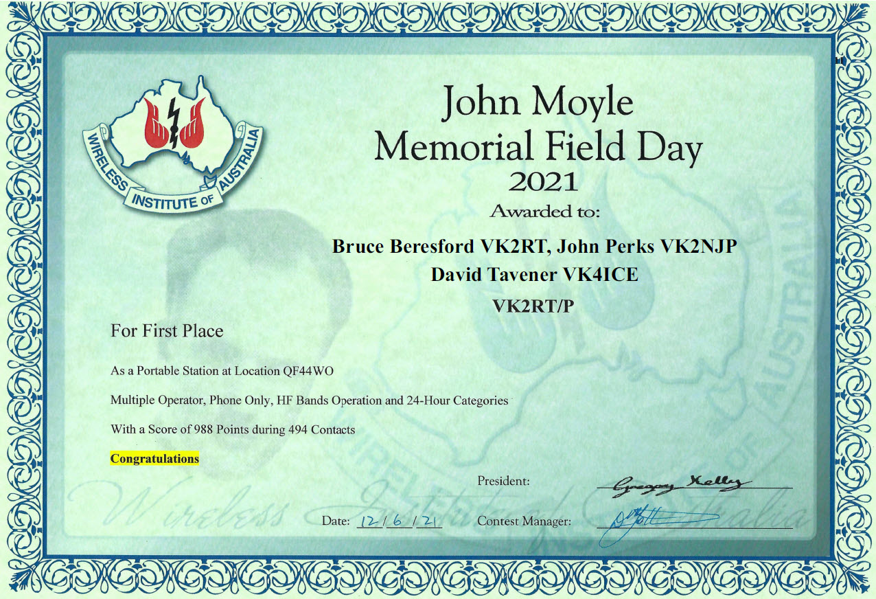 JOHN MOYLE FIELD DAY - 2021 Callsign Used VK2RT/P Location Durran Durra - QF44wo Operators Bruce (VK2RT), John (VK2NJP), David (VK4ICE)