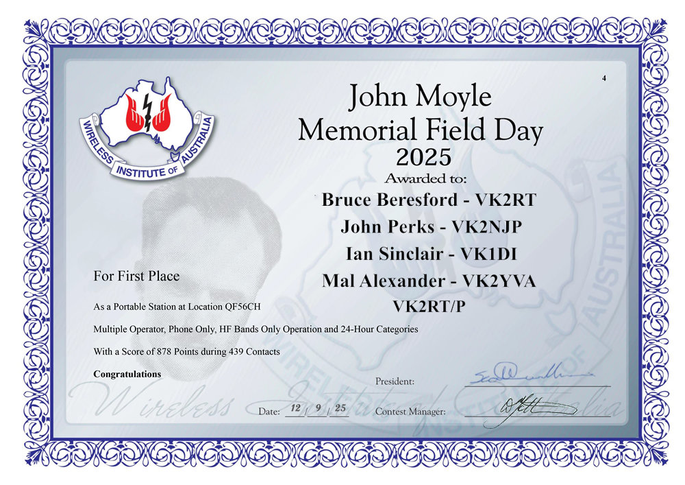JOHN MOYLE FIELD DAY - 2025 Callsign Used VK2RT/P Location Durran Durra - QF44wo Operators Bruce (VK2RT), John (VK2NJP), Mal (VK2YVA), Ian (VK1DI)
